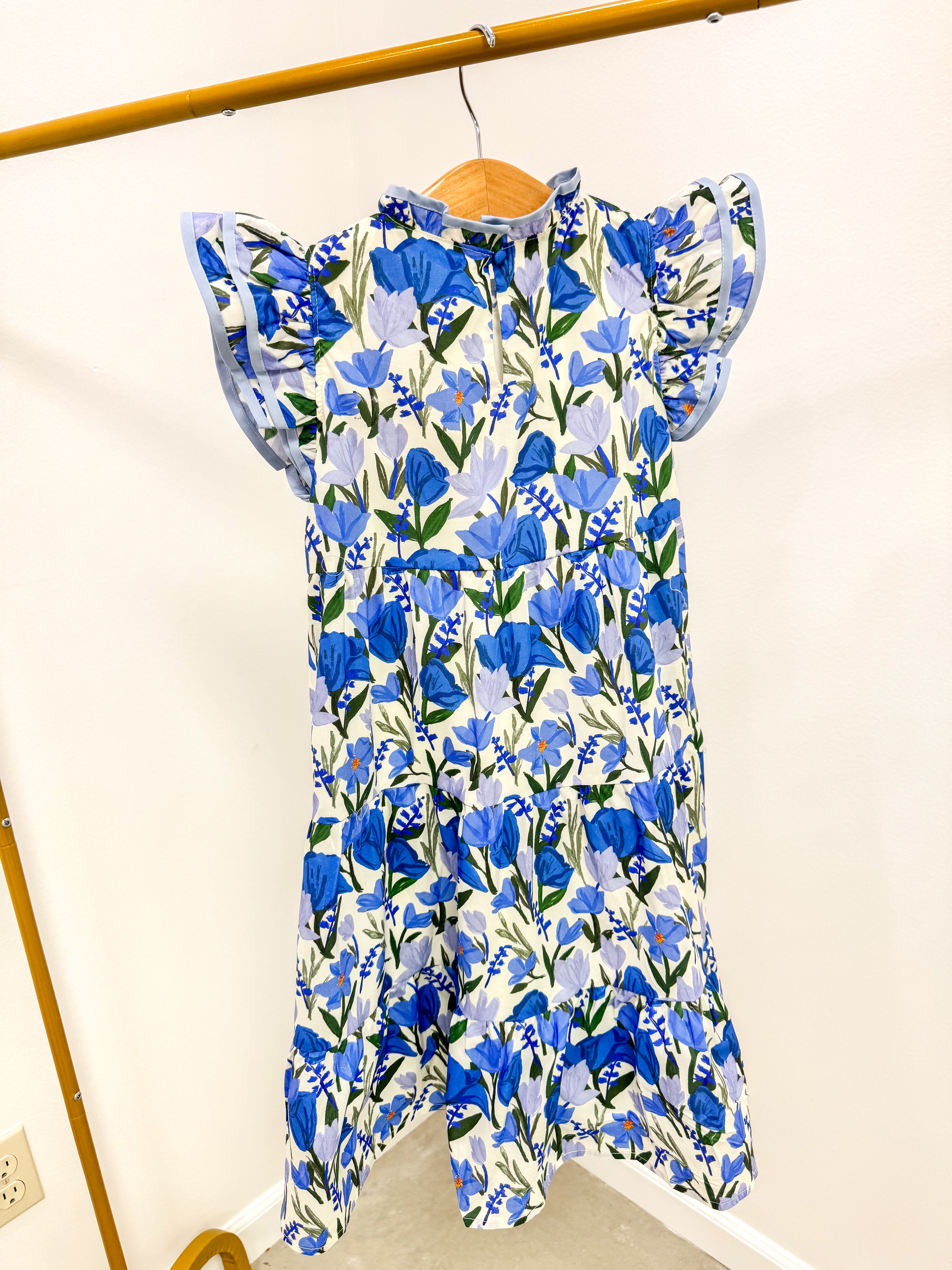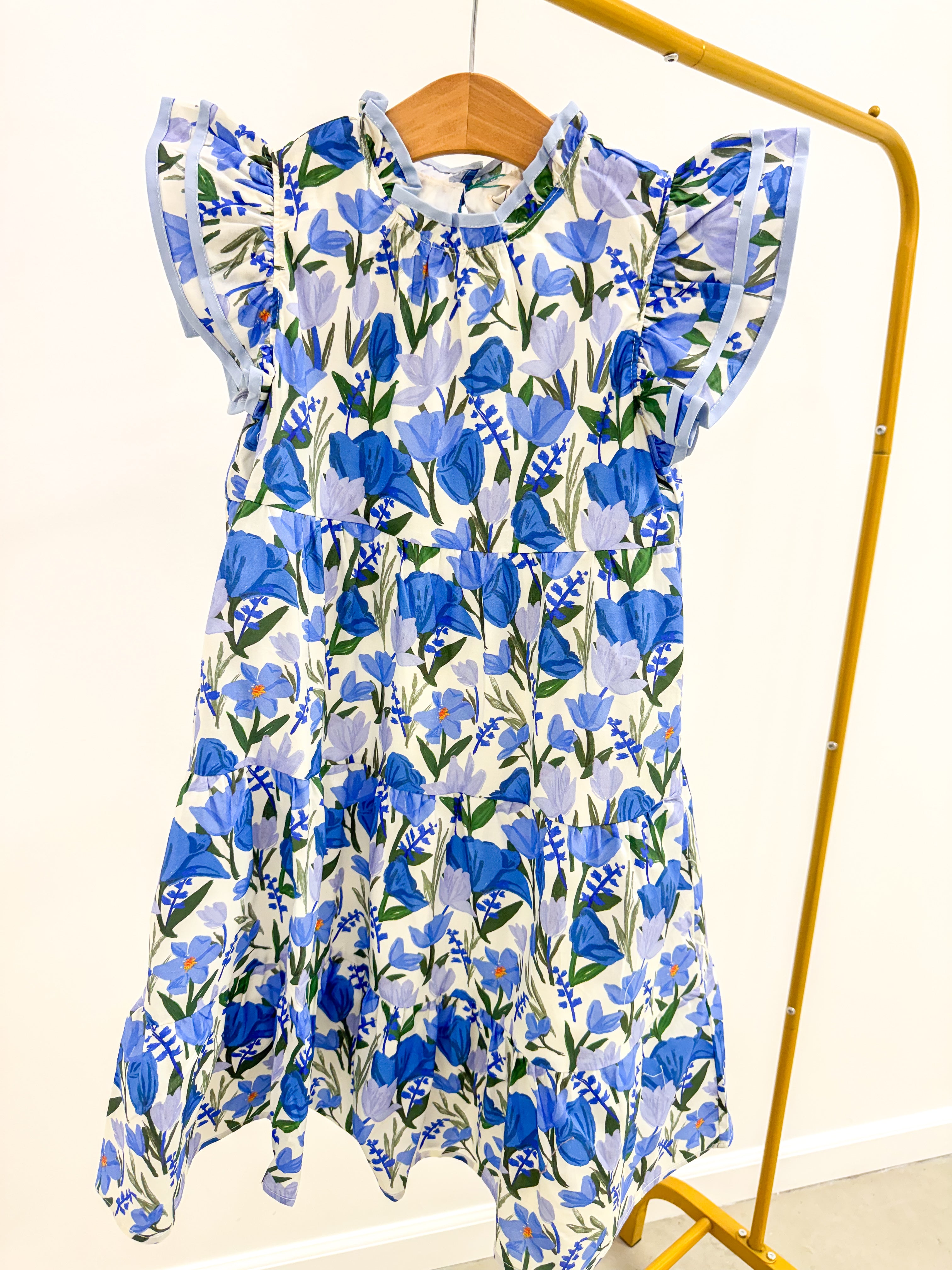 Girls Blue Contrast Piped Ruffle neck Floral Tank Dress
