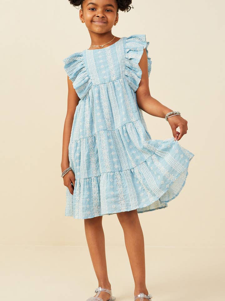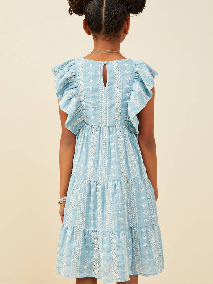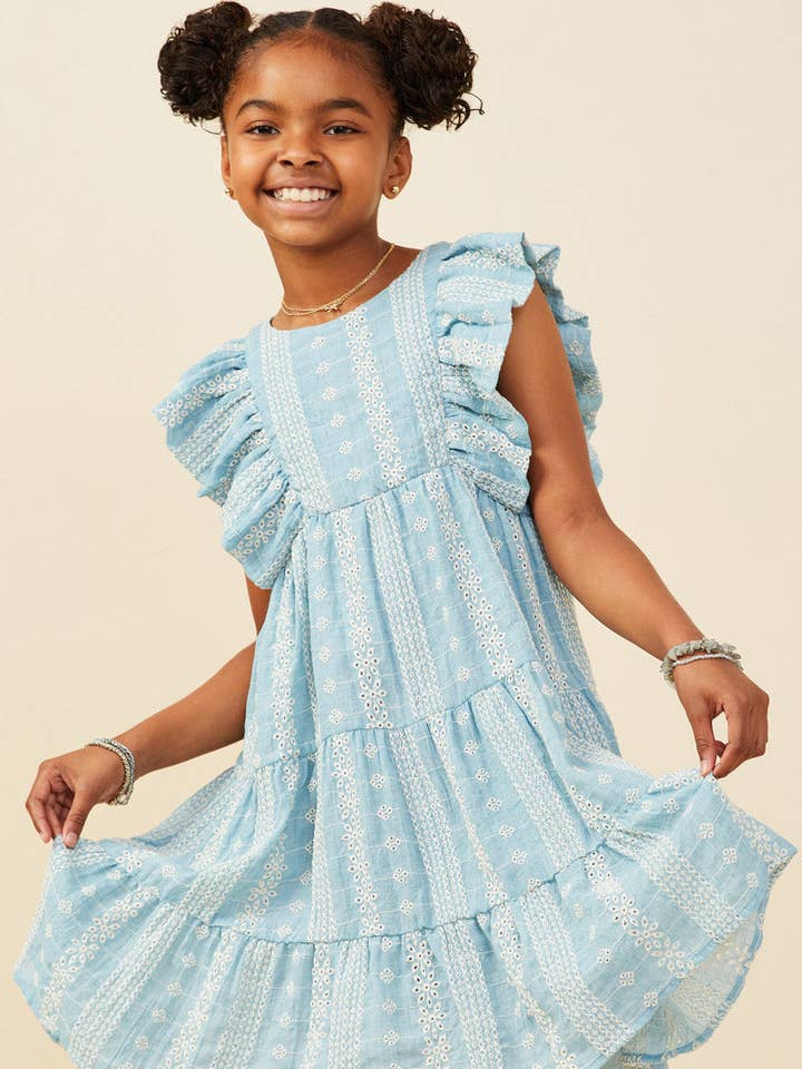 Our Embroidered Ruffled Lace Sleeveless Dress Features: * Embroidered Fabric * Round Cut Neckline * Tiered Detail Measurements: Size Length Chest Small 29" 14" Medium 30.5" 15" Large 32" 16" X-Large 33.5" 17.5" The measurements in the chart above reflect the garment laying flat. For body measurements please visit our Size Guide. Model Stats: * Height: 4'7" * Wearing Size: S Material & Care: * 65% Polyester 35% Cotton * Hand Wash Cold * Hang Dry