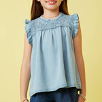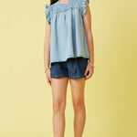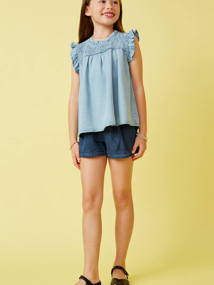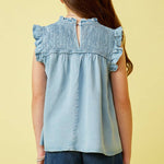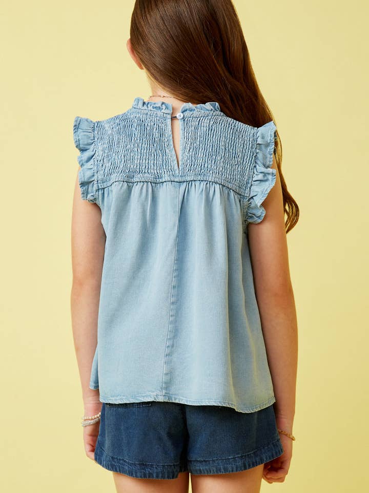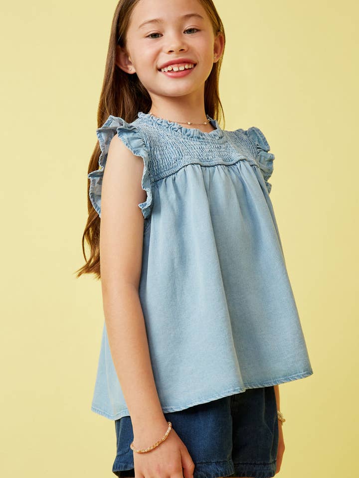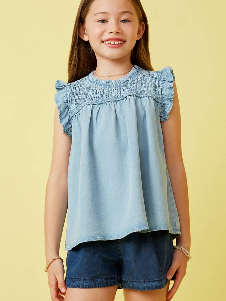 Product Details: Our Ruffle Detailed Smocked Denim Tencel Tank Features: * Washed Tencel Fabric * Ruffle Detail * Back Keyhole Closure Measurements: Size The measurements in the chart above reflect the garment laying flat. For body measurements please visit our Size Guide. Model Stats: * Height: 4'2" * Bust: 25" * Waist: 24" * Hip: 28" * Wearing Size: S Material & Care: * 100% Tencel * Hand Wash Cold * Hang Dry