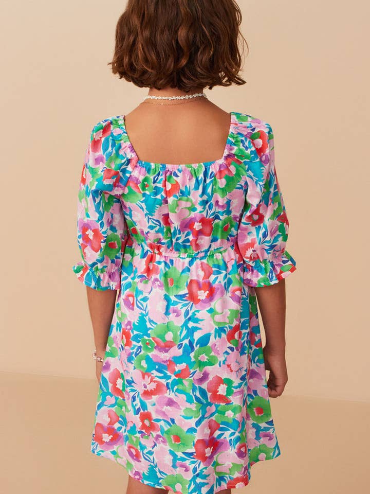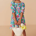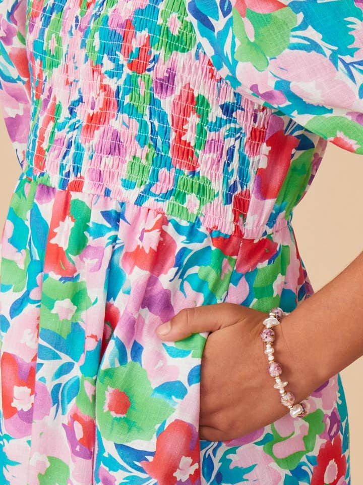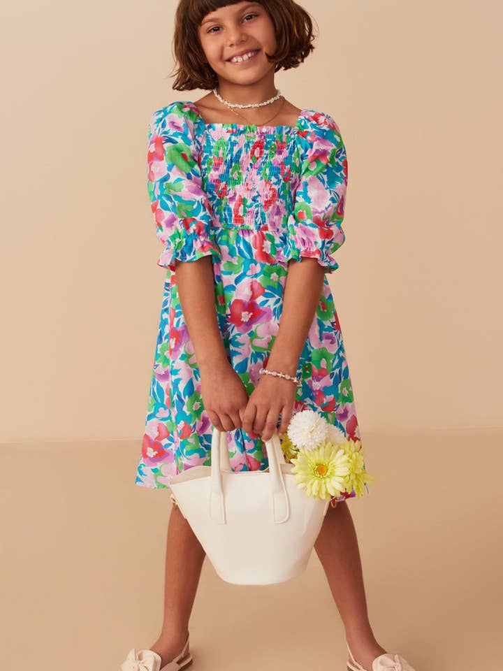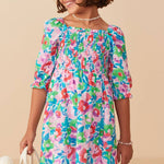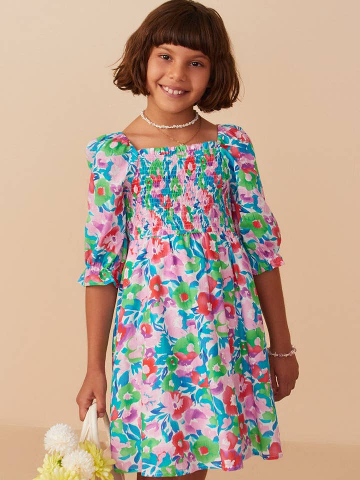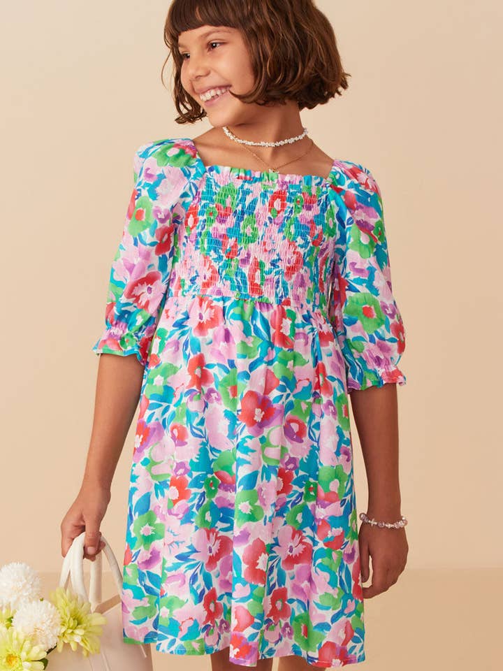 Girls Multi Vivid Floral Smocked Long Sleeve Dress