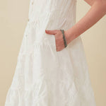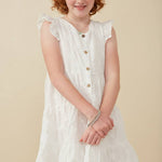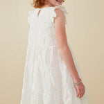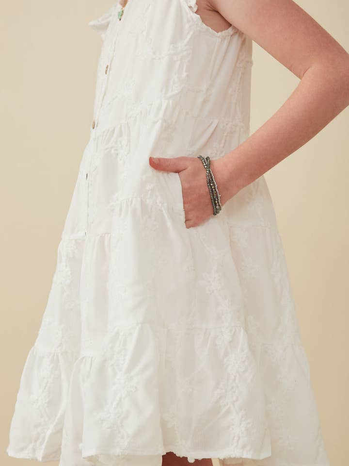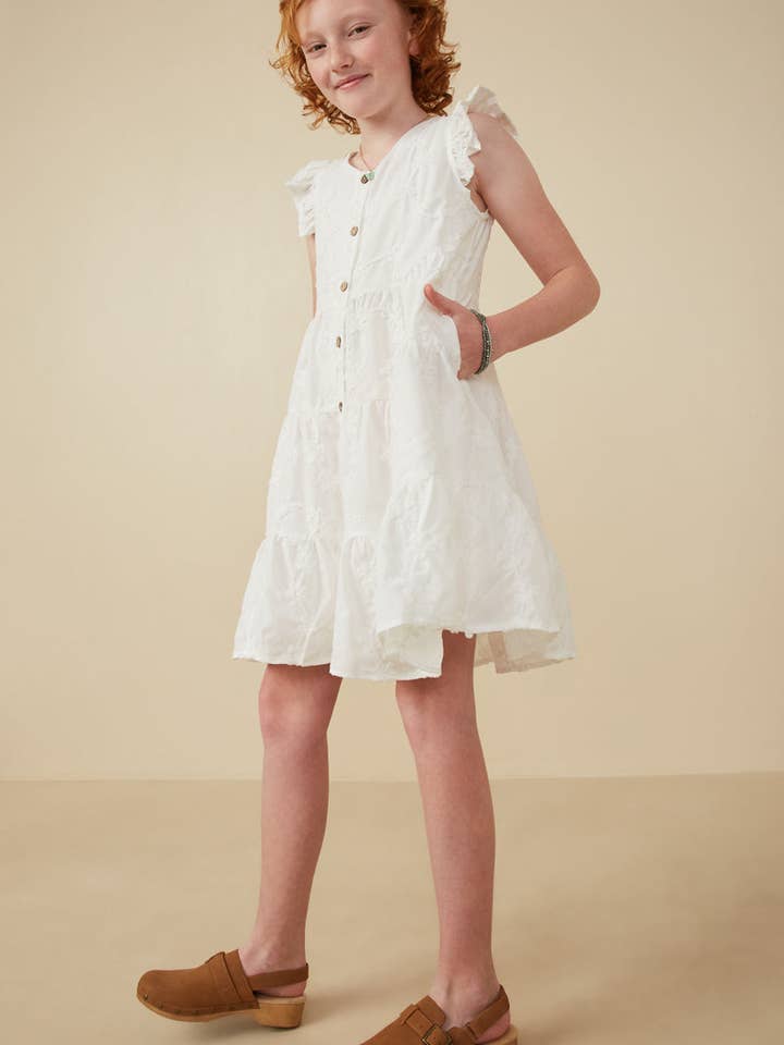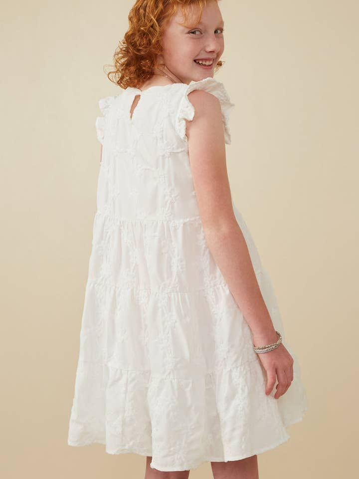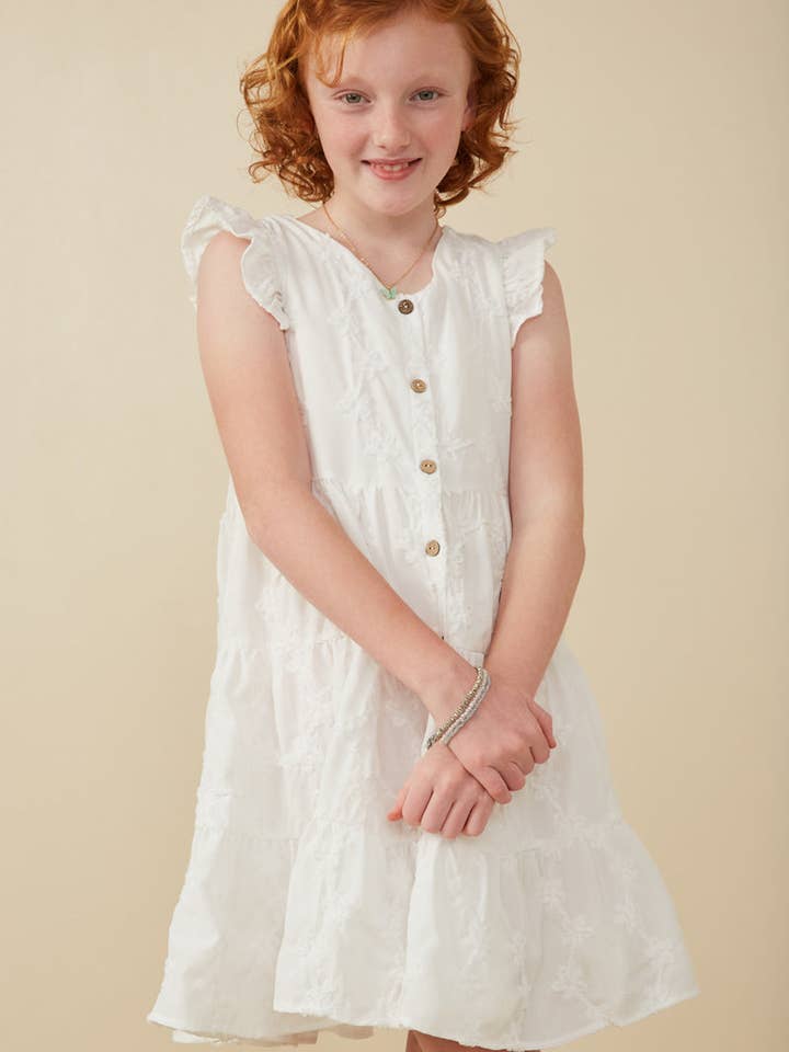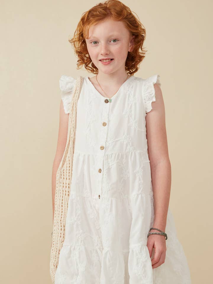 Girls Off White Textured Floral Button Tiered Dress