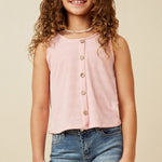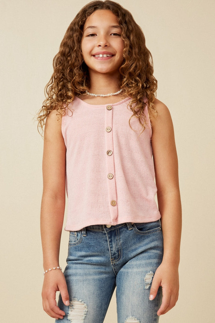 Product Details: Our Patterned Button Detail Knit Tank Features: * Knit Fabric * Decorative Front Buttons * Round Cut Neckline Measurements: Size The measurements in the chart above reflect the garment laying flat. For body measurements please visit our Size Guide. Model Stats: * Height: 4'2" * Bust: 26" * Waist: 22" * Hip: 28" * Wearing Size: S Material & Care: * Hand Wash Cold * Hang Dry