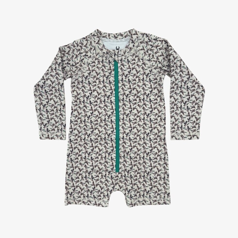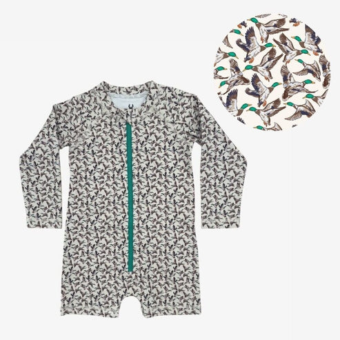 Designed for little explorers who fly fast and play hard, this all-in-one UPF 50+ swimsuit offers full sun protection without sacaficing style. Featuring our Delta Wings all over mallard print, it's made for days spent chasing waves, casting lines or hanging out at the pool. The front zipper makes for easy on and off - even when wet - and the quick dry fabric keeps him comfortable from sunrise to sunset.