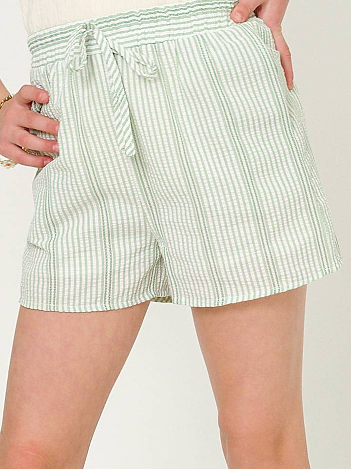 Our Lace Seersucker Elastic Waist Shorts Features: * Woven Fabric * Elastic Waistline with Tie * Smocked Detail Measurements: Size Waist Inseam Small 10.5" 2.5" Medium 11.25" 2.63" Large 12" 2.75" X-Large 12.75" 2.88" The measurements in the chart above reflect the garment laying flat. For body measurements please visit our Size Guide. Model Stats: * Height: 4'4" * Wearing Size: S Material & Care: * Hand Wash Cold * Hang Dry