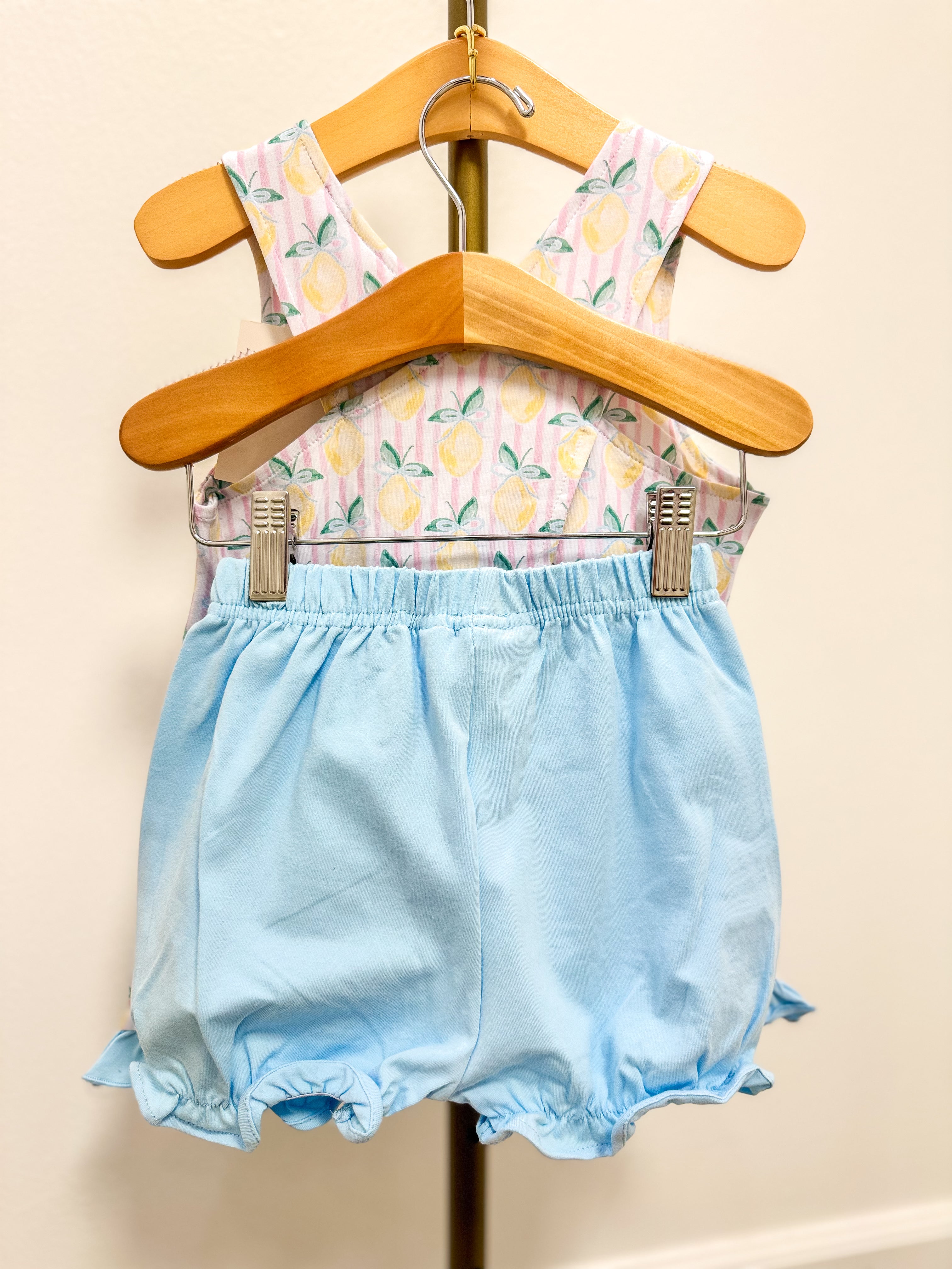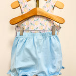 The classic bubble shorts silhouette paired with a sleeveless tank creates the perfect balance of vintage charm and modern comfort. Soft mint green florals dance across the top while coordinating aqua blue bottoms provide endless stretch for all her wiggles and giggles. The timeless styling means she'll look picture-perfect whether she's chasing butterflies or snuggling up for story time.
