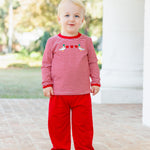 • Red trim on neckline and cuffs