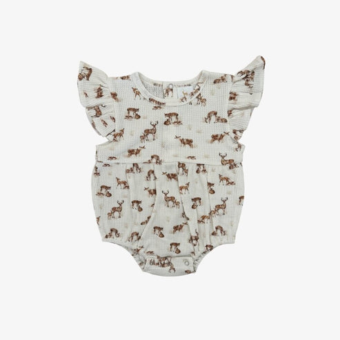 Elevate your little one's wardrobe with the Harlowe Bubble - a charming blend of comfort and style. Crafted from soft waffle knit fabric, this one-piece features delightful flutter sleeves for a touch of playfulness. Adorned with our sweet 'deer' woodland deer all over print. Whether for playdates or sunny strolls, the Harlowe Bubble ensures your little one stays cute and comfy!