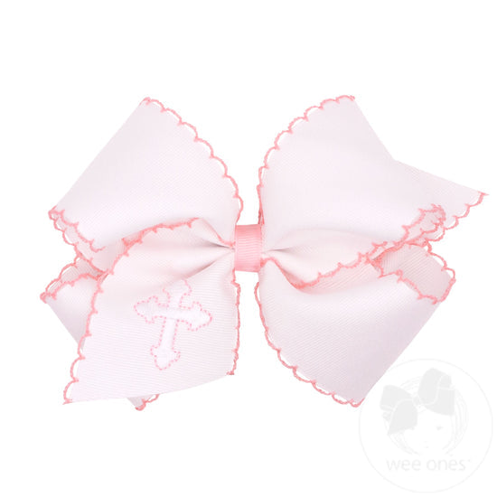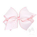 She’ll look heavenly with our white grosgrain king hair bow! Our light pink moonstitch edge and cross embroidery on the tail give it a unique edge for any special occasion—perfect for Baptism, First Communions, Easter, and more! This bow is sure to stay in her hair all day with our patented WeeStay™ no-slip hair clip.