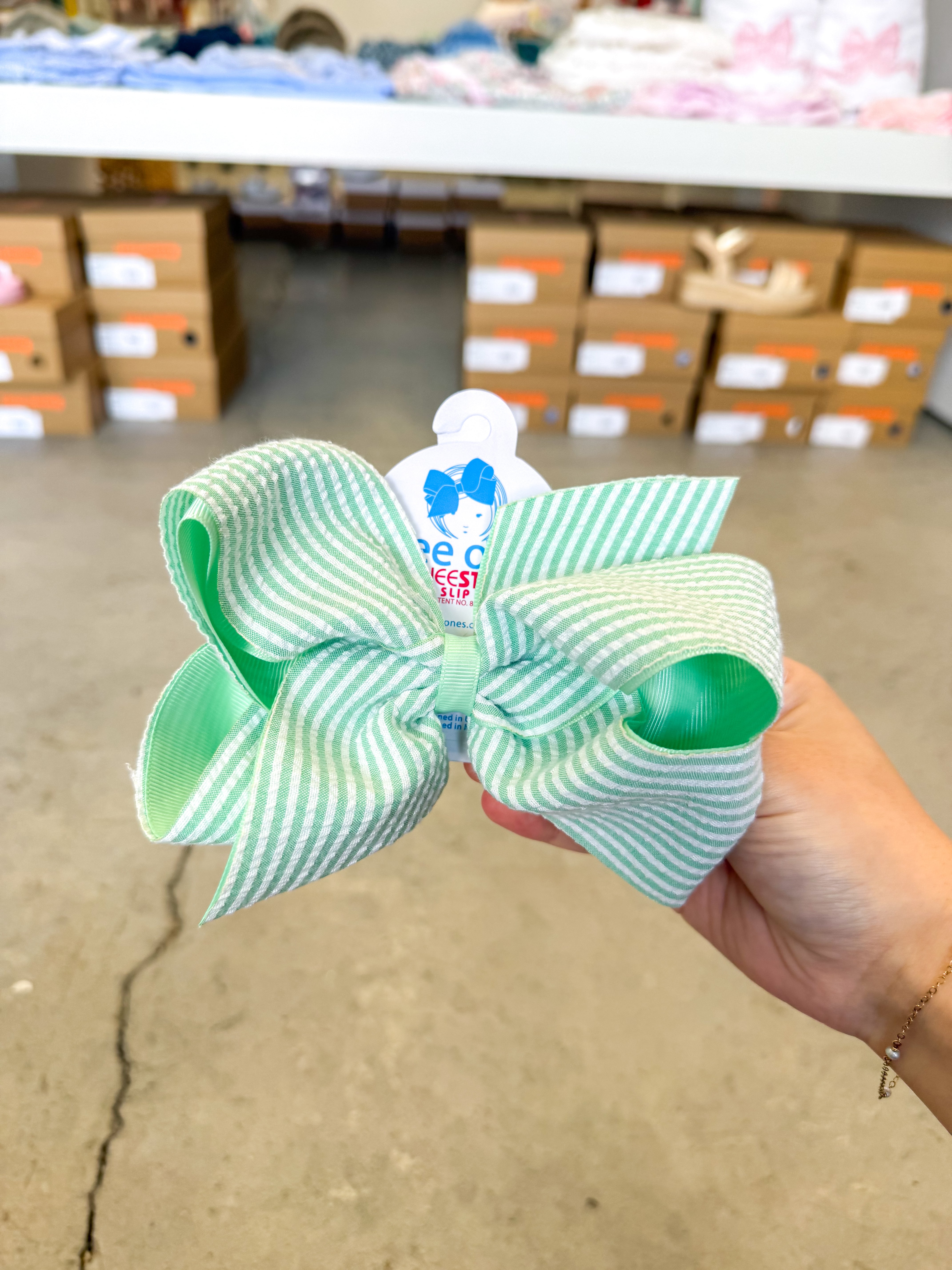 Classic and preppy, this is the king genuine seersucker hair bow for girls everyone will be asking for this year! This bow is sure to stay in her hair all day with our patented WeeStay™ no-slip hair clip. This hair bow is available in pink, white, and blue.