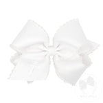 She’ll look heavenly with our white grosgrain king hair bow! Our light pink moonstitch edge and cross embroidery on the tail give it a unique edge for any special occasion—perfect for Baptism, First Communions, Easter, and more! This bow is sure to stay in her hair all day with our patented WeeStay™ no-slip hair clip.