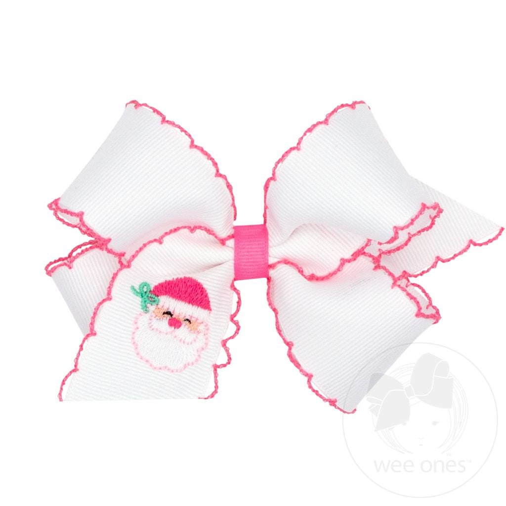 Add a sprinkle of holiday cheer with this moonstitch edge grosgrain bow featuring adorable pink Christmas embroidery. From reindeer to sugar cookies, each design brings a festive pop to her look. This bow is sure to stay in her hair all day with our patented WeeStay™ no-slip hair clip.