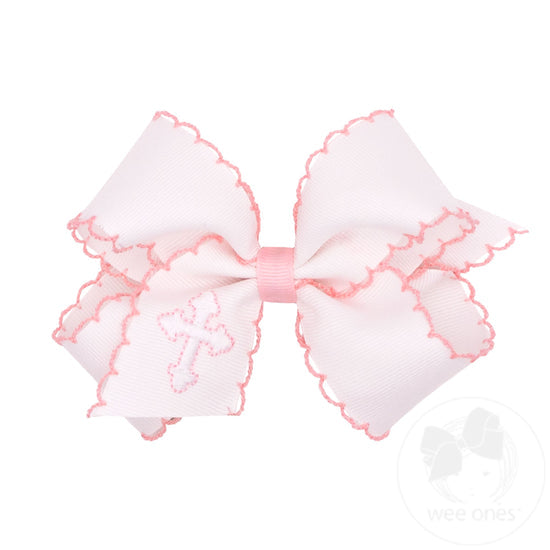 She’ll look heavenly with our white grosgrain medium hair bow! Our light pink moonstitch edge and cross embroidery on the tail give it a unique edge for any special occasion—perfect for Baptism, First Communions, Easter, and more! This bow is sure to stay in her hair all day with our patented WeeStay™ no-slip hair clip.