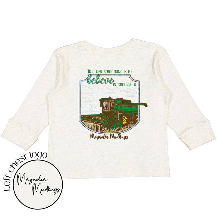 "To plant something is to believe in tomorrow." This tee has stolen our hearts and it will steal yours too. Designs features a combine, crops, cloudy sky, and the perfect inspirational quote. This design is on a Honey Dew colored tee, which is very pale neutral that hints to a minty yellow hue. This is a back design with our new signature left chest logo we are rolling out for the 2024 Fall line. Tee is 100% cotton