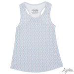 The soft blue base with delicate pink and white florals gives off those dreamy vintage vibes, while the relaxed fit means she can actually move and play. The scoop neckline with white contrast trim adds that extra touch that makes it special, not basic. It's the kind of tank that works under a cardigan for family dinner or solo for playground adventures.