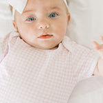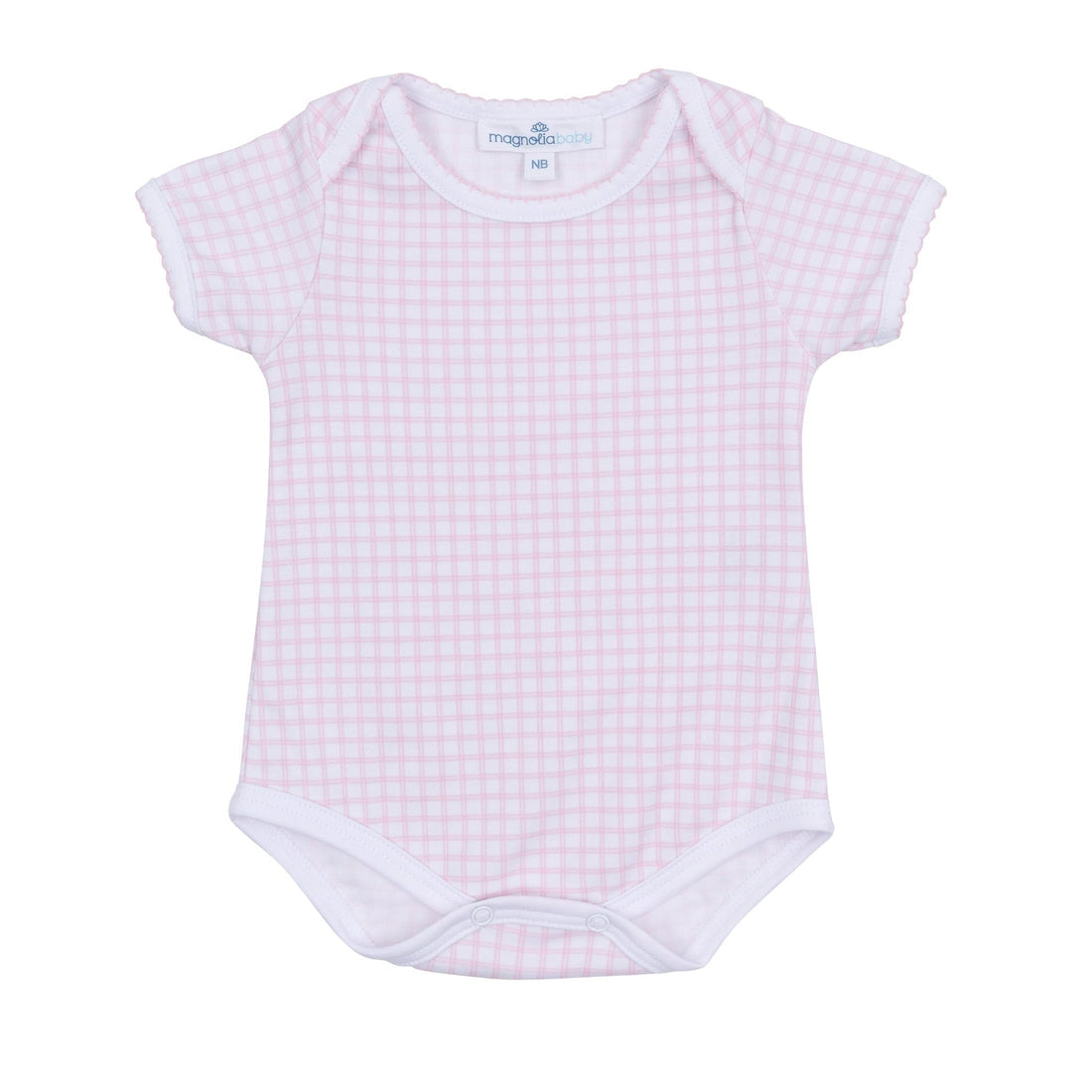 Offering simple comfort with our Peek-A-Boo Wishes Lap Bodysuit in pink, crafted from the most luxurious Pima cotton. This adorable bodysuit features delicate pink picot trim and a charming check pattern, perfect for spending quality time with family, visiting loved ones, a delightful first adventure at the park.