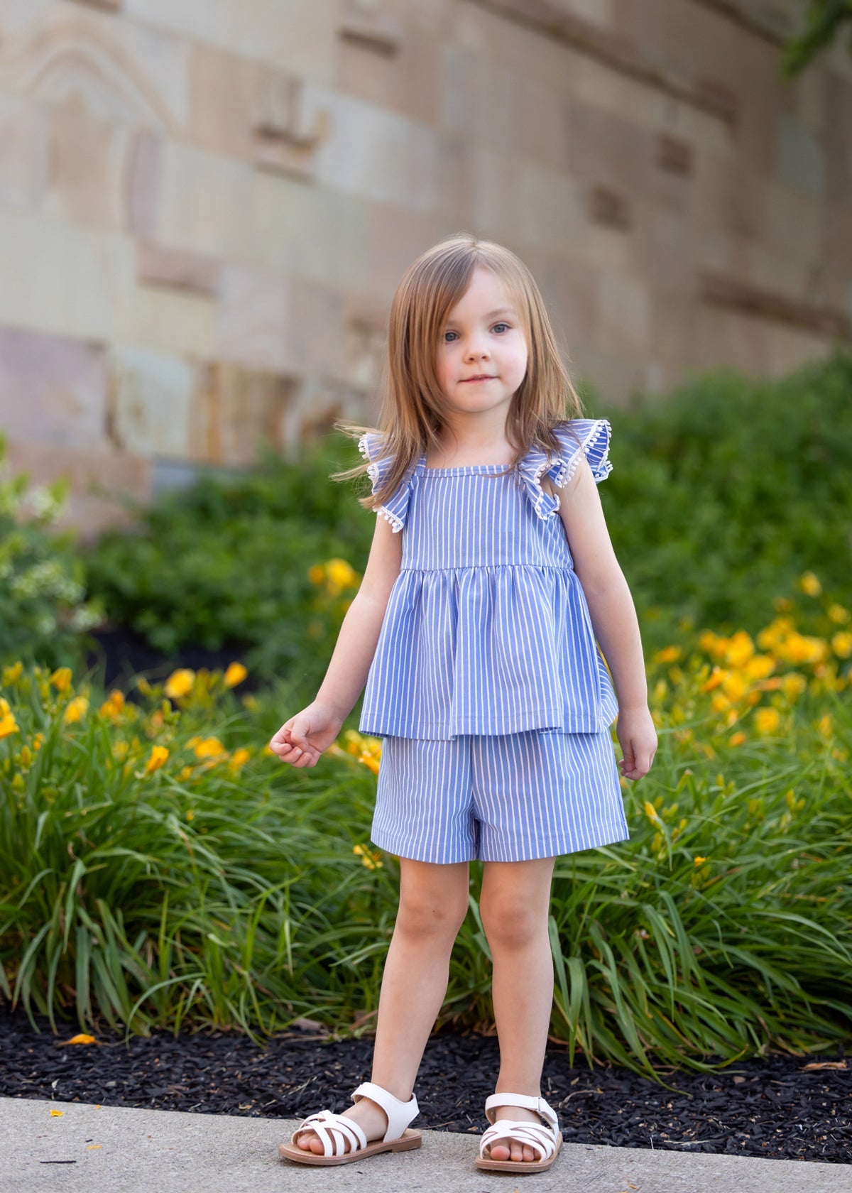 This striped knit two-piece set features flutter sleeves with pom-pom trims. Paired with casual matching shorts, it offers a playful, comfortable outfit for warm-weather adventures.
